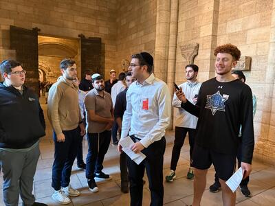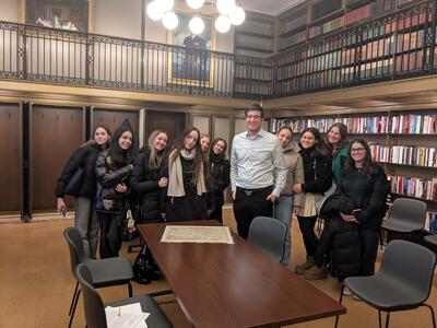 The course, taught at both of YU’s undergraduate campuses, featured several guest lectures from YU faculty. On September 25th, Dr. Steven Fine, Churgin Professor of Jewish History, presented a comparison of Titus in rabbinic and Roman sources, drawing on a portion of his current book project. On November 27th, Dr. Shaina Trapedo, Assistant Professor of English at Stern College and Resident Scholar at the Straus Center, delivered a lecture titled “Beyond the Stage: Aliens and Antisemitism in Europe Through the Lens of Shakespeare’s The Merchant of Venice.” And on December 9th, Dr. Ronnie Perelis, the Alcalay Associate Professor of Sephardic Studies at YU’s Bernard Revel Graduate School of Jewish Studies, presented on the “Relation of Antonio Montezinos” in Menasseh ben Israel’s book The Hope of Israel (1650), which promulgated the curious claim that some native Americans descended from the Ten Lost Tribes of ancient Israel.